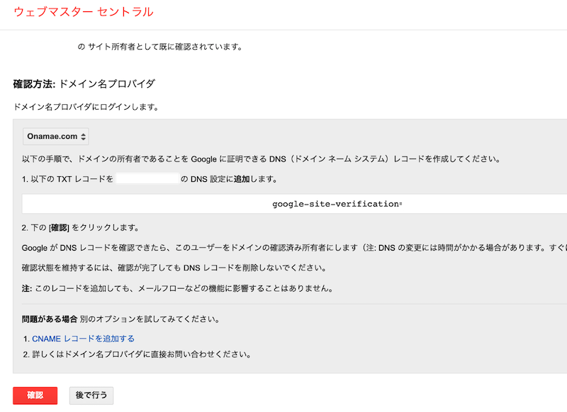 TXT - テキストデータにウェブマスターセントラルのページ上で指定された値 (“以下のTXTレコードを…“部分)